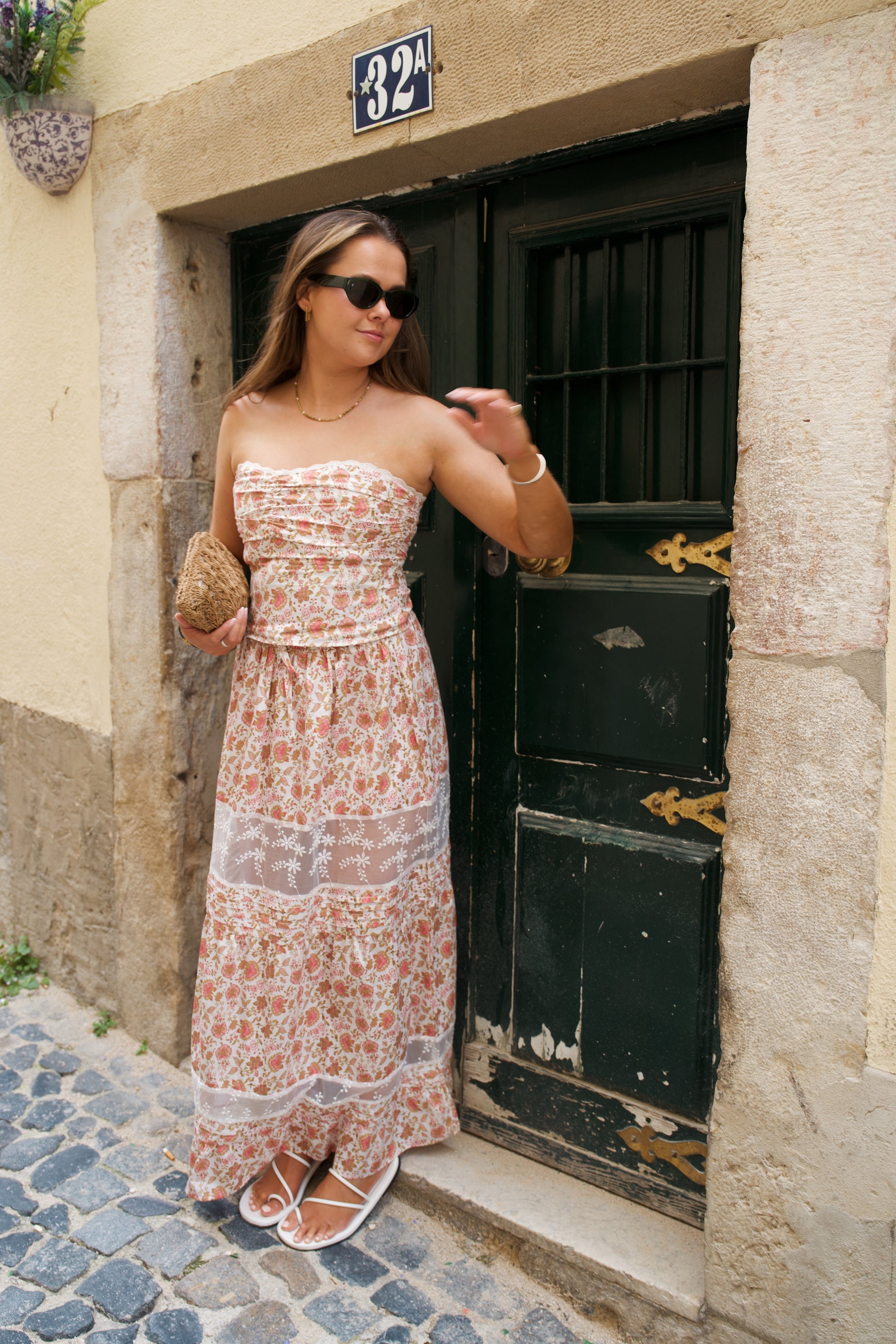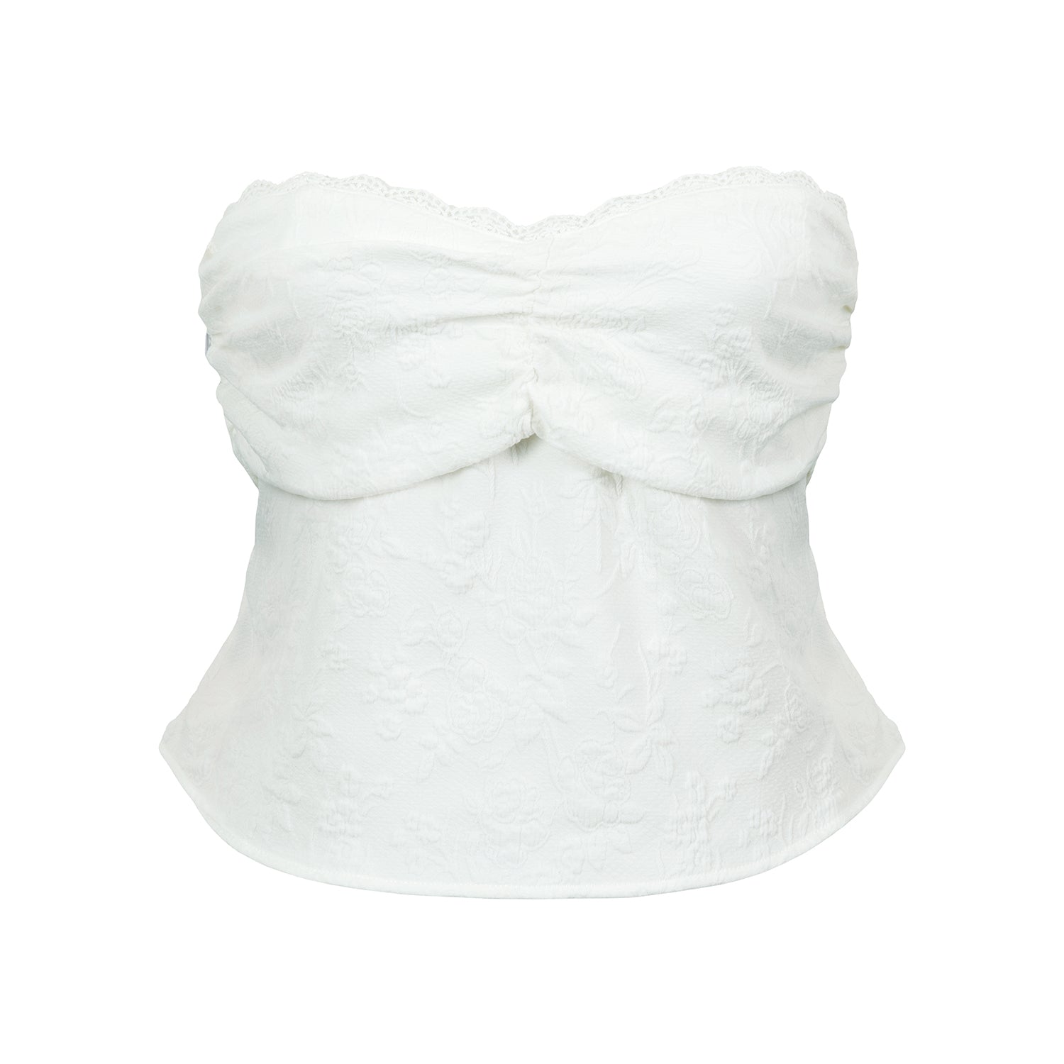 A soft, structured crop top with delicate lace detailing across the bust. Cut in a subtle A-line shape that flicks out gently at the hem for a flattering, easy fit.