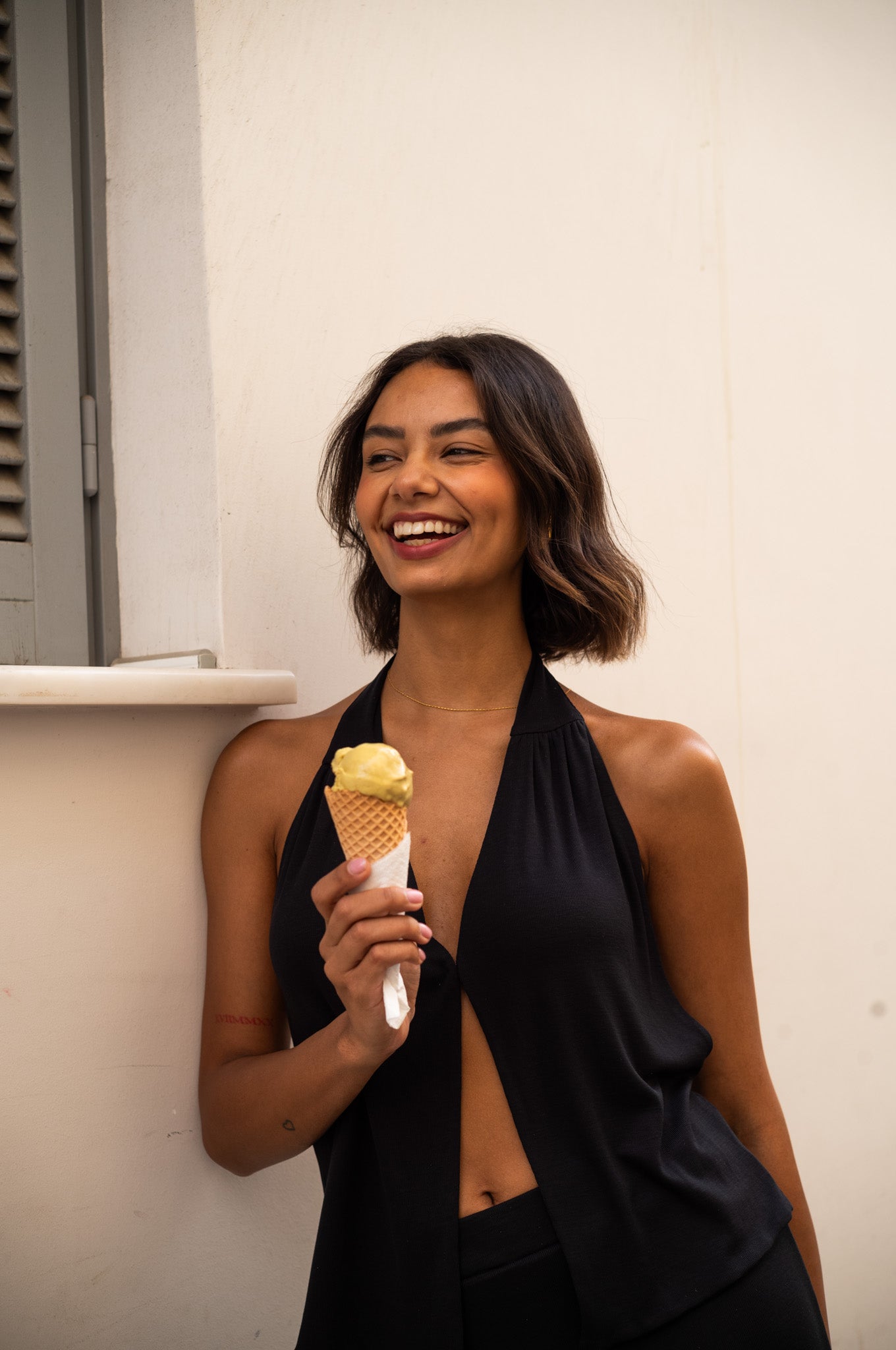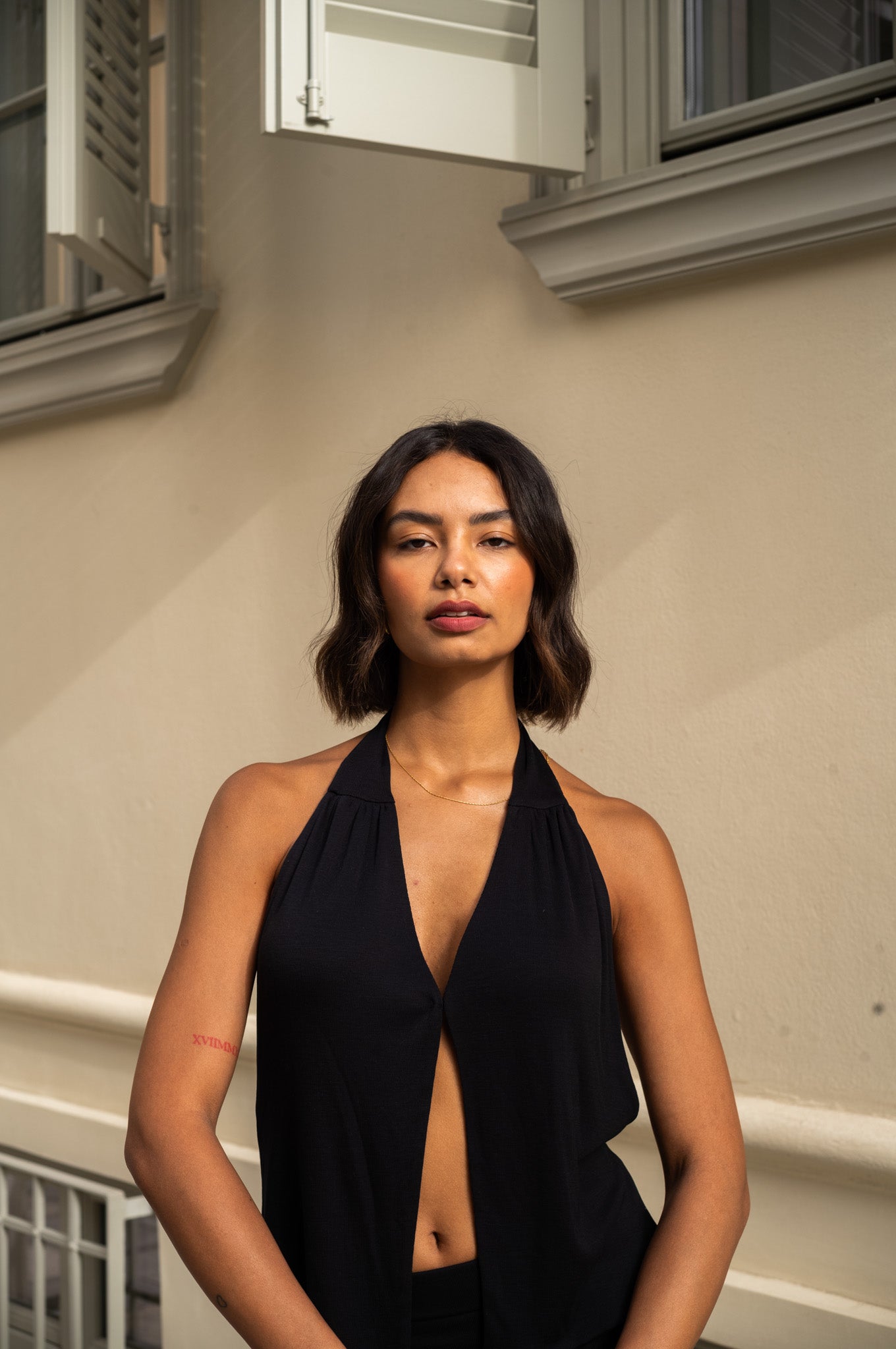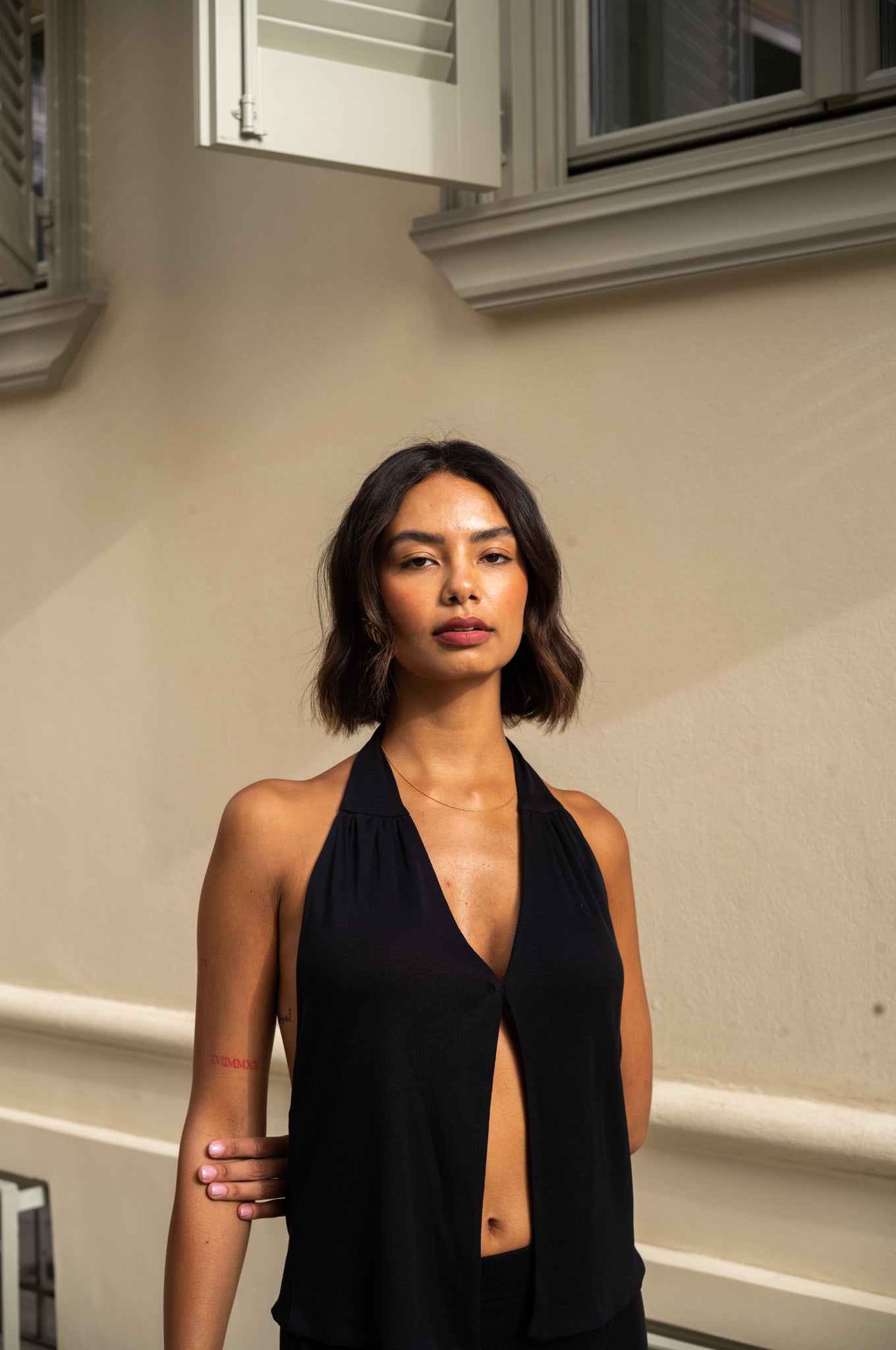 The Herodes top is crafted from 100% lyocell, a soft and environmentally friendly material that drapes beautifully and has a slinky appearance. It features a clasp closure, a flattering V-neckline, and an open back.