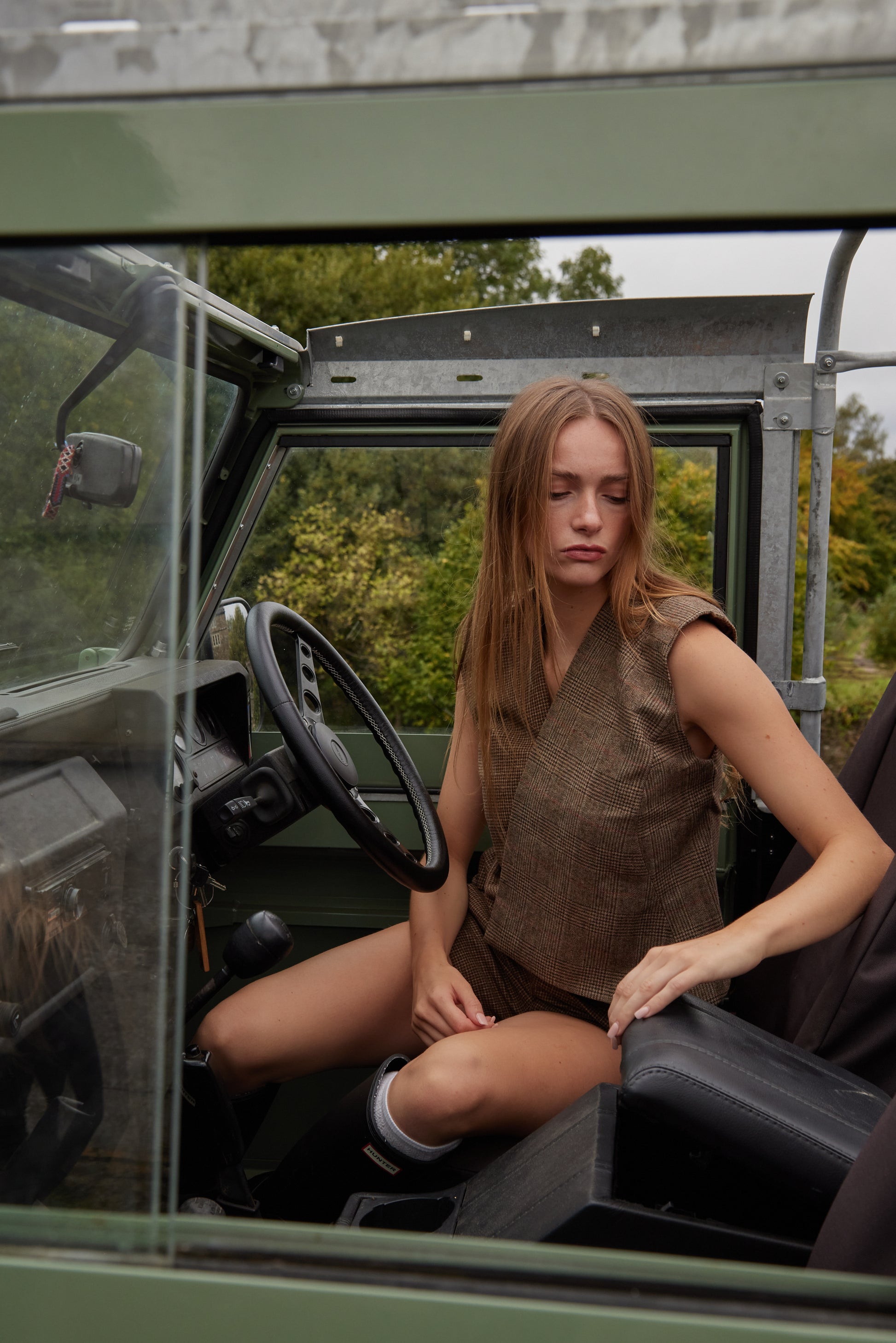 Crafted in a rich brown check wool, it features an overlapping front with a seamless finish and wide, sleeveless shoulders for a bold yet refined look. The slightly cropped cut adds contemporary ease, making it a statement layering piece that bridges countryside tradition with city style. It is crafted from a patchwork of traditional brown checks, with one half in a finer micro-check and the other in a bold oversized check.